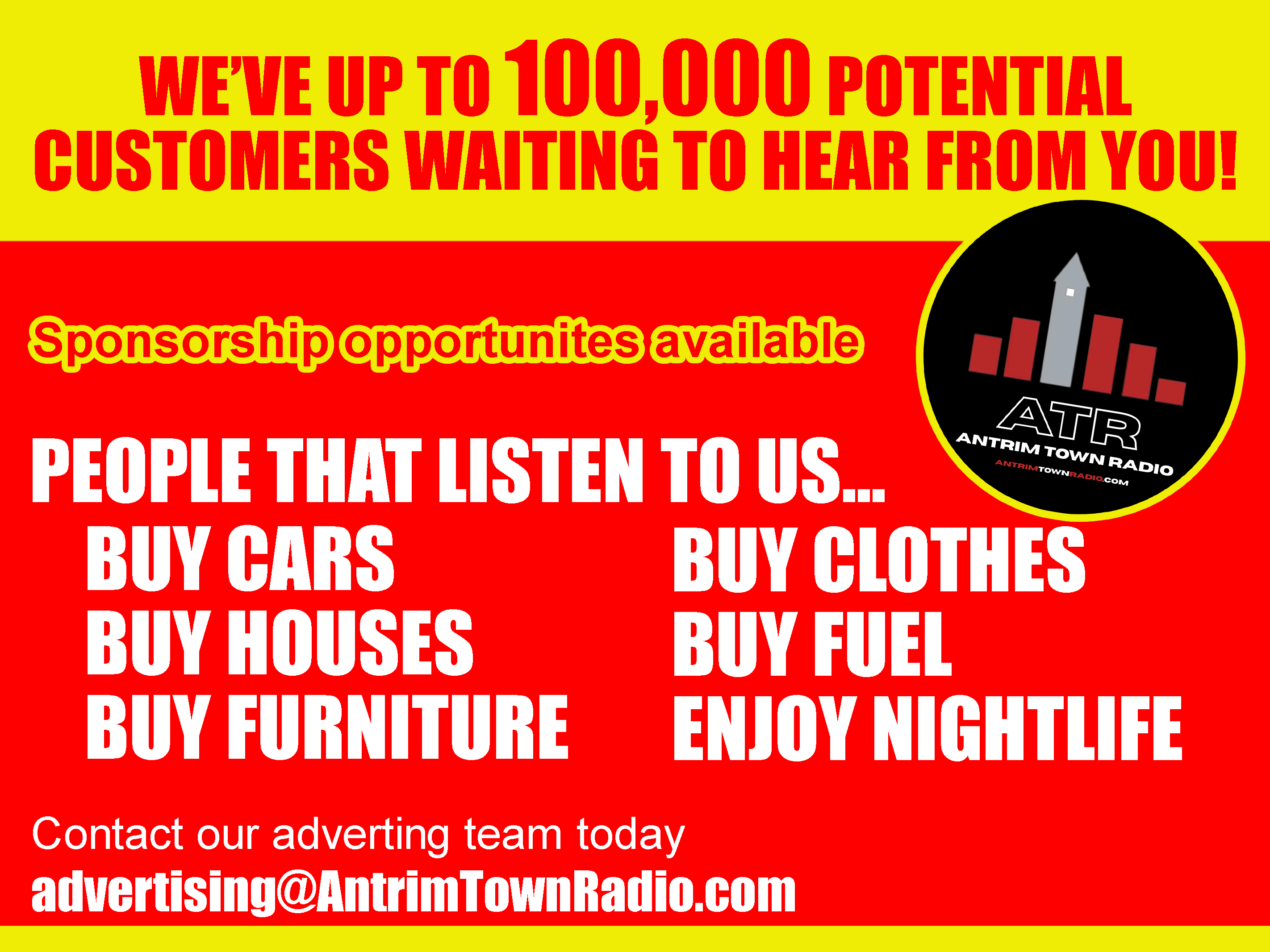 We have various advertising and sponsorship opportunities available on Antrim Town Radio. For further information please contact our sales and promotions team on advertising@antrimtownradio.com